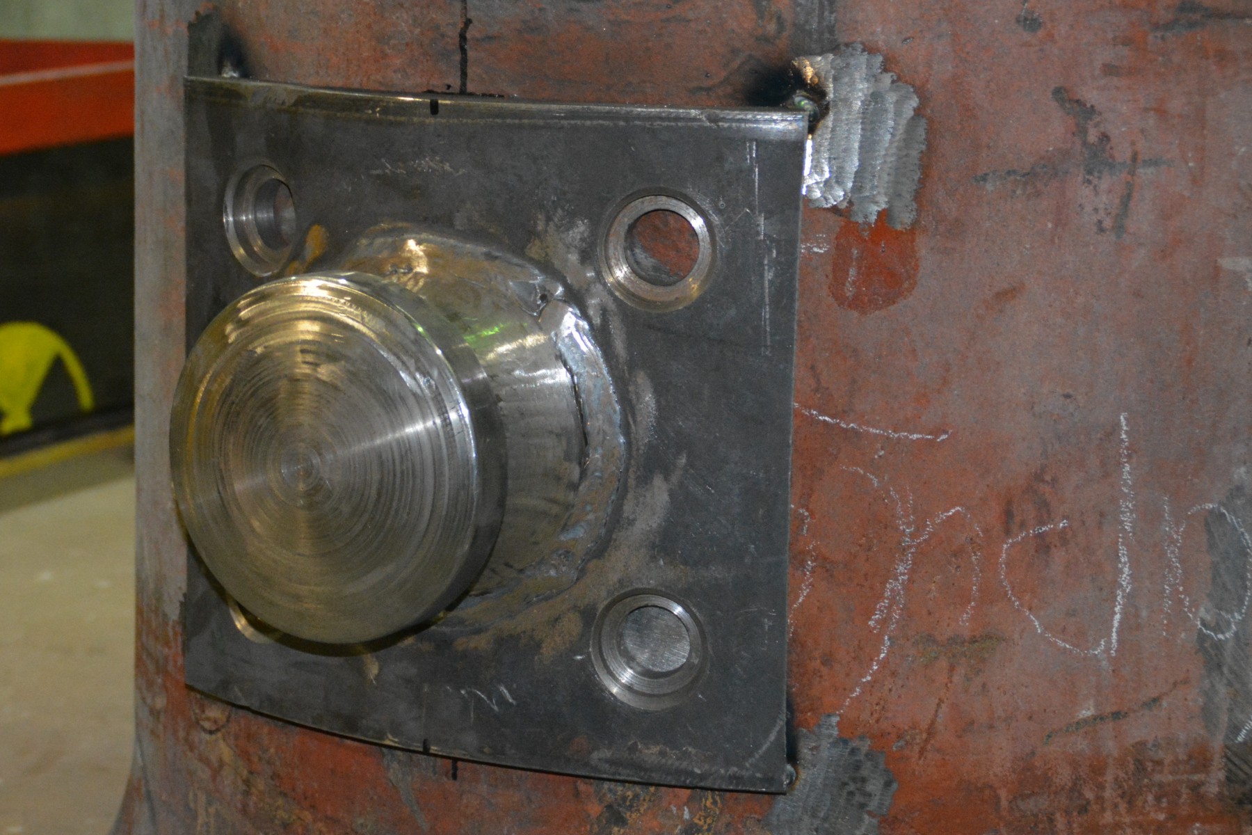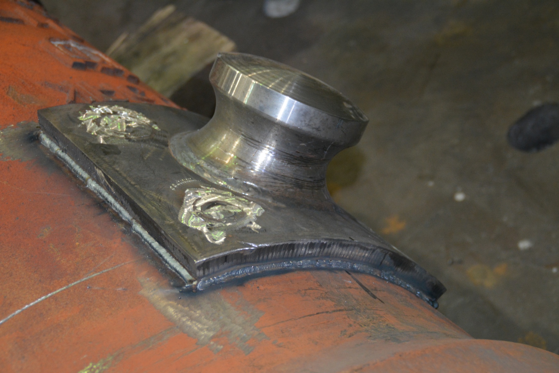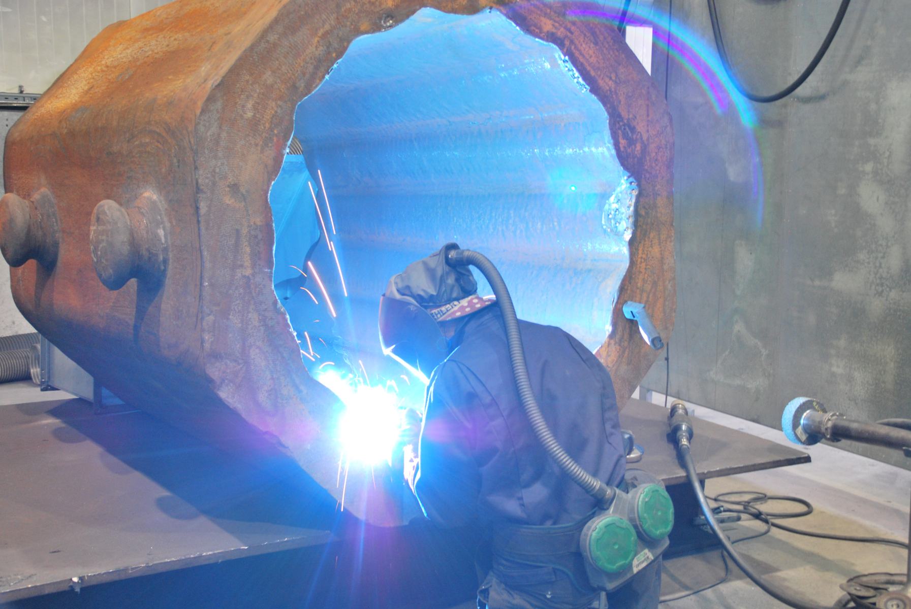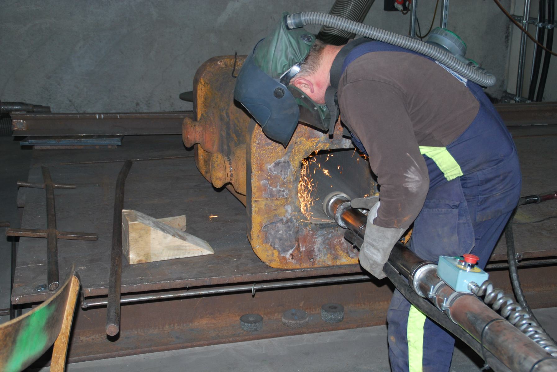 Nach dem Schleifen wird Die Kokille zum Schweißarbeitsplatz gebracht, wo die gebrochenen Teile, Lunkern und andere Fehler heraus geschweißt werden. Nach dem Schweißen wird die Kokille mit einer Handschleifmaschine oder, bei kleineren Schäden, mit einem Winkelschleifer geschliffen.