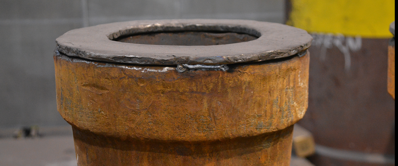 Der Trichter wird zuerst von Gussrückständen gereinigt. Anschließend wird ein Ring an die Oberseite des Trichters geschweißt, um ein gleichmäßiges Schleifen zu ermöglichen. Die beschädigten Trichter werden auf zwei Drehvorrichtungen montiert. Mit einem speziellen Verfahren wird der Boden des Trichters geschliffen. Sobald der Trichter eben ist oder in aufrechter Position nicht mehr wackelt, ist der Schleifvorgang abgeschlossen. Anschließend wird der Ring am oberen Ende des Trichters entfernt und der Trichter ist wieder einsatzbereit.